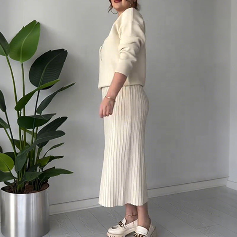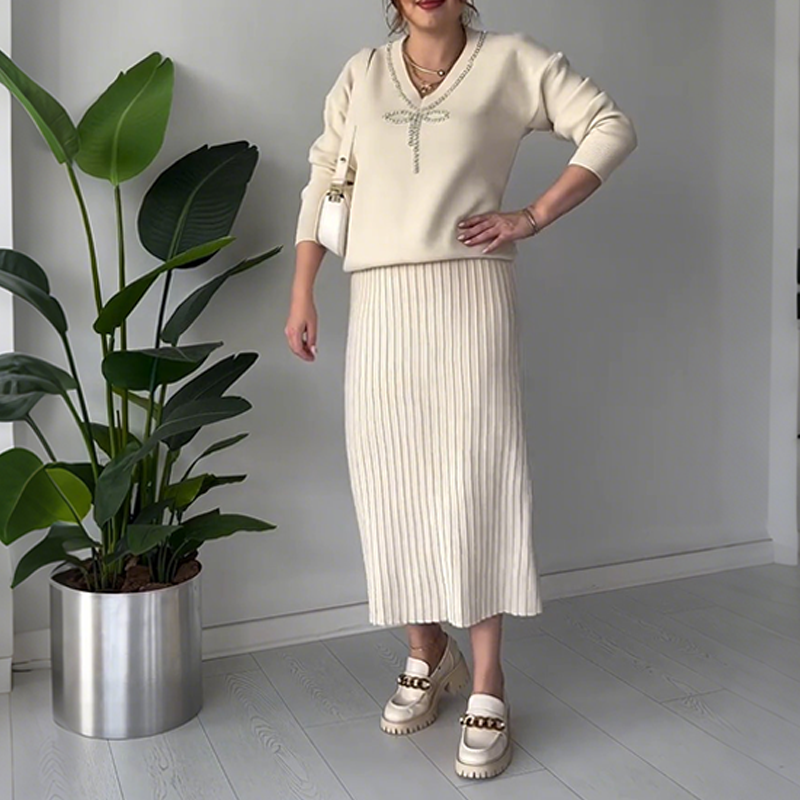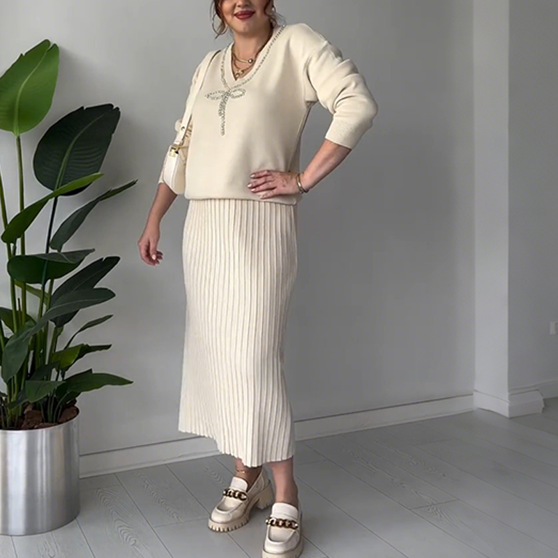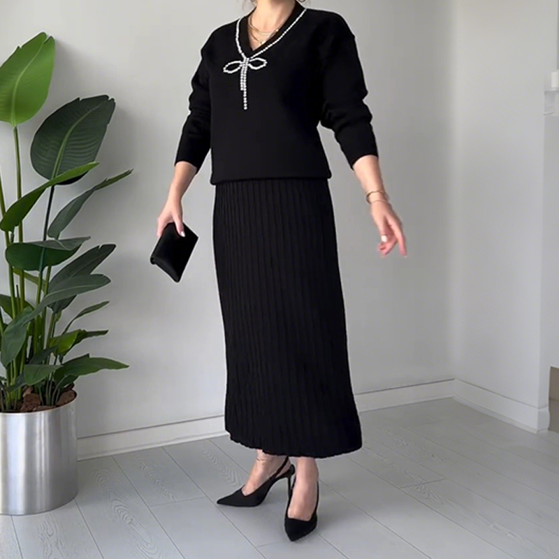 Elegantes zweiteiliges Set aus Pullover und Rock mit Strassschleife für Damen